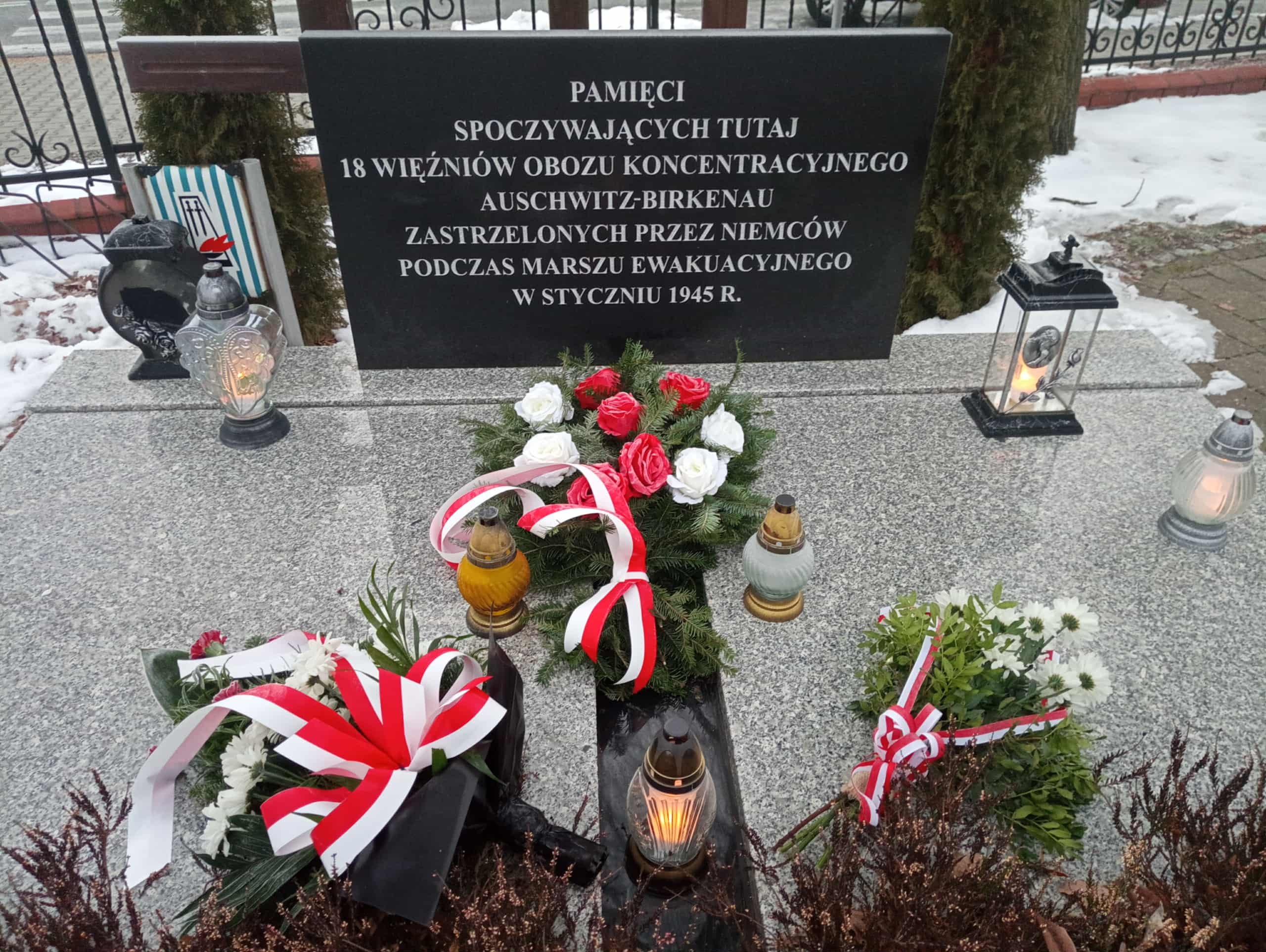 Drugi dzień XIV Marszu Pamięci to jednocześnie rocznica wymarszu pierwszych kolumn więźniów na trasę ewakuacji. Z tej okazji grupa uczestników naszego przedsięwzięcia wzięła udział w uroczystościach, które rozpoczęły się od spotkania ze społecznością Zespołu Szkolno – Przedszkolnego w Miedźnej. Oprócz uczniów oraz nauczycieli pojawili się tutaj przedstawiciele władz wojewódzkich, delegacje gmin z powiatu pszczyńskiego, a także samorządowcy z Gminy Miedźna. Podczas okolicznościowej akademii, przygotowanej przez uczniów i nauczycieli tutejszej placówki, głos mieli okazje zabrać również nasi przedstawiciele: Robert Furtak, Zbigniew Bubak oraz Monika Mrozek. W trakcie spotkania dowiedzieliśmy się, że planowane jest wydanie książki ze wspomnieniami dotyczącymi „marszu śmierci” w tej okolicy, gdzie miałby się pojawić rozdział o historii „Marszu Pamięci”. W tym miejscu kierujemy do społeczności lokalnej z Miedźnej serdeczne słowa podziękowania za gościnę w murach miejscowej szkoły, a także wspólne oddawanie czci ofiarom „marszu śmierci”, co dzieje się już od kilku lat… Po zakończeniu uroczystości na terenie szkoły wszyscy zebrani udali się na miejscowy cmentarz przy ul. Wiejskiej, gdzie znajduje się zbiorowa mogiła więźniów. Tutaj złożono kwiaty i zapalono znicze, a ponadto mieliśmy okazję do przyłączenia się do modlitwy, której przewodniczył ksiądz katolicki oraz wysłuchać jej również w języku hebrajskim. Po zakończeniu uroczystości na cmentarzu grupa udała się w kierunku Pszczyny, a na trasie do Ćwiklic – po raz pierwszy - towarzyszyli nam uczniowie i nauczyciele ze szkoły w Miedźnej. Być może zrodzi się również tradycja wspólnego marszu do kolejnego miejsca pamięci na naszym szlaku. Po kilku kilometrach pieszej wędrówki grupa naszych piechurów oraz młodzież szkolna z Miedźnej spotkała się z przedstawicielami społeczności Szkoły Podstawowej nr 7 im. Żołnierzy Września w Ćwiklicach. Obok budynku tej placówki znajduje się odrestaurowany w poprzednim roku pomnik, który upamiętnia wszystkich poległych na polach bitew oraz w obozach koncentracyjnych w latach 1939 – 1945. Była tu okazja do rozmowy na temat wydarzeń ze stycznia 1945 roku, krótkie refleksje na temat tragicznego losu więźniów pędzonych w „marszu śmierci”, a kapłan posługujący w pobliskiej parafii wskazał nam miejsce, gdzie nocowali nieszczęśnicy podążający przez tutejszą okolicę w marszu ewakuacyjnym z Auschwitz. Podjęliśmy decyzję, że odwiedzimy ten budynek w kolejnym roku i będzie on kolejnym przystankiem na trasie Marszu Pamięci od 2026 roku. Po spotkaniu z uczniami i nauczycielami ze szkół w Ćwiklicach i Miedźnej ruszyliśmy w kierunku Pszczyny. W tej miejscowości co roku odwiedzamy dwa miejsca pamięci. Pierwsze z nich to pamiątkowa tablica, która mieści się nieopodal bramy stadionu przy ul. Bogedeina. W trakcie ewakuacji więźniów KL Auschwitz w tej okolicy gromadzono grupy prowadzonych ludzi, a następnie dzielono ich na nowe kolumny i kierowano w stronę Wodzisławia Śląskiego dwiema trasami – przez Jastrzębie – Zdrój oraz Żory. Z okazji 80. rocznicy tragicznych wydarzeń ze stycznia 1945 roku podjęliśmy decyzję, że tydzień po zakończenia XIV Marszu Pamięci im. Jana Stolarza, wyruszymy także na szlak prowadzący z Pszczyny przez Suszec, Rudziczkę, Żory, Rój, Świerklany i Marklowice aż do wodzisławskiego dworca kolejowego, aby odwiedzić wszystkie miejsca związane z „marszem śmierci” na trasie z Oświęcimia do Wodzisławia. Pomysłodawcą tej akcji był Robert Furtak, który wcześnie samodzielnie przeszedł tę trasę, a organizacji przedsięwzięcia podjął się Tomasz Przybylski z Żor. Jest on twórcą wystawy „Przeżyliśmy Gross-Rosen”, a jej ekspozycję mieliśmy okazję zobaczyć na zakończenie XIII Marszu Pamięci na terenie wodzisławskiego Pałacu Dietrichsteinów. Po opuszczeniu centrum Pszczyny grupa udała się na cmentarz św. Krzyża przy ul. Wodzisławskiej. Tutaj można znaleźć zbiorową mogiłę więźniów, którzy zmarli lub zginęli na trasie ewakuacyjnej w okolicy Pszczyny, a także tablicę, która upamiętnia najmłodszą ofiarę „marszu śmierci” – Ireneusza Rowińskiego. Ten chłopiec w momencie zgonu miał tylko 9 dni, a jego matka – Leokadia Rowińska – pochowała go w pudełku po makaronie… Grupa odmówiła tutaj modlitwę w intencji wszystkich Ofiar, a po chwili refleksji i zapaleniu zniczy udaliśmy się w dalszą drogę. Kolejnym przystankiem był kościół p.w. św. Maksymiliana Kolbe w Porębie, zbudowany jako wotum dziękczynne. Obok świątyni mieści się sugestywna rzeźba wspomnianego świętego z symboliką obozowego płotu i drutów kolczastych. Rozmawialiśmy tutaj o męczeńskiej śmierci Kolbego, który oddał życie za innego więźnia KL Auschwitz, ale także o wielu innych świadectwach człowieczeństwa wśród ludzi, którzy przebywali w obozach koncentracyjnych… Ruszając w dalszą drogę skierowaliśmy się w stronę miejscowości Brzeźce. Tutaj – od zeszłego roku – spotykamy się przy mogile znajdującej się na przykościelnym cmentarzu z przedstawicielami społeczności lokalnej. Wśród nich są miejscowi radni gminni, członkowie rady sołeckiej, a także osoby działające w okolicznym ośrodku kultury. Ideę Marszu Pamięci wspiera też miejscowy serwis internetowy „Brzeźce dla Was”, który szeroko promuje nasze przedsięwzięcie. Po uroczystości na cmentarzu grupa została zaproszona na gorącą kawę i herbatę, a także ciepły posiłek, po czym piechurzy udali się w kierunku Studzionki. Tutaj wszyscy, którzy korzystają z noclegu, są podejmowani w prywatnych domach przez mieszkańców. Taka tradycja zrodziła się już podczas pierwszej edycji Marszu Pamięci, który miał miejsce w dniach 5 – 6 stycznia 2012 roku…