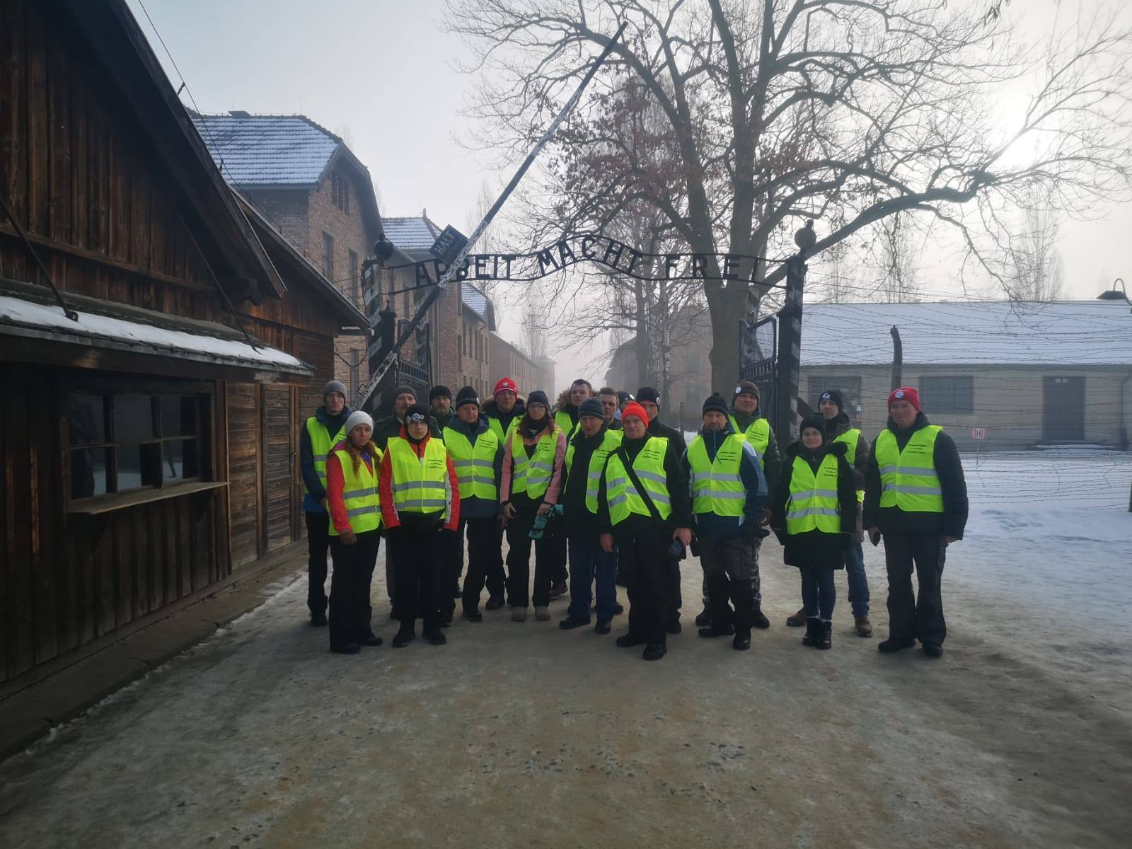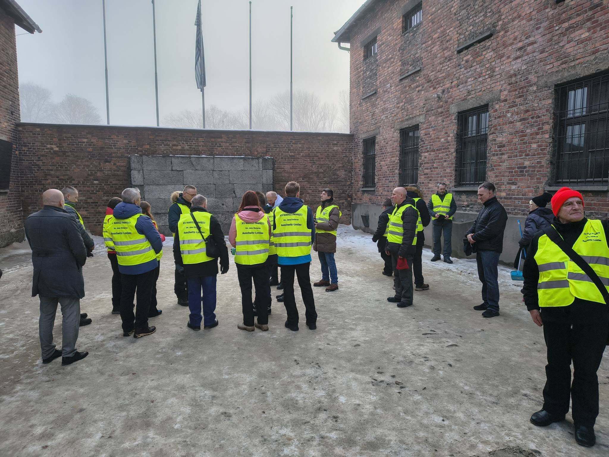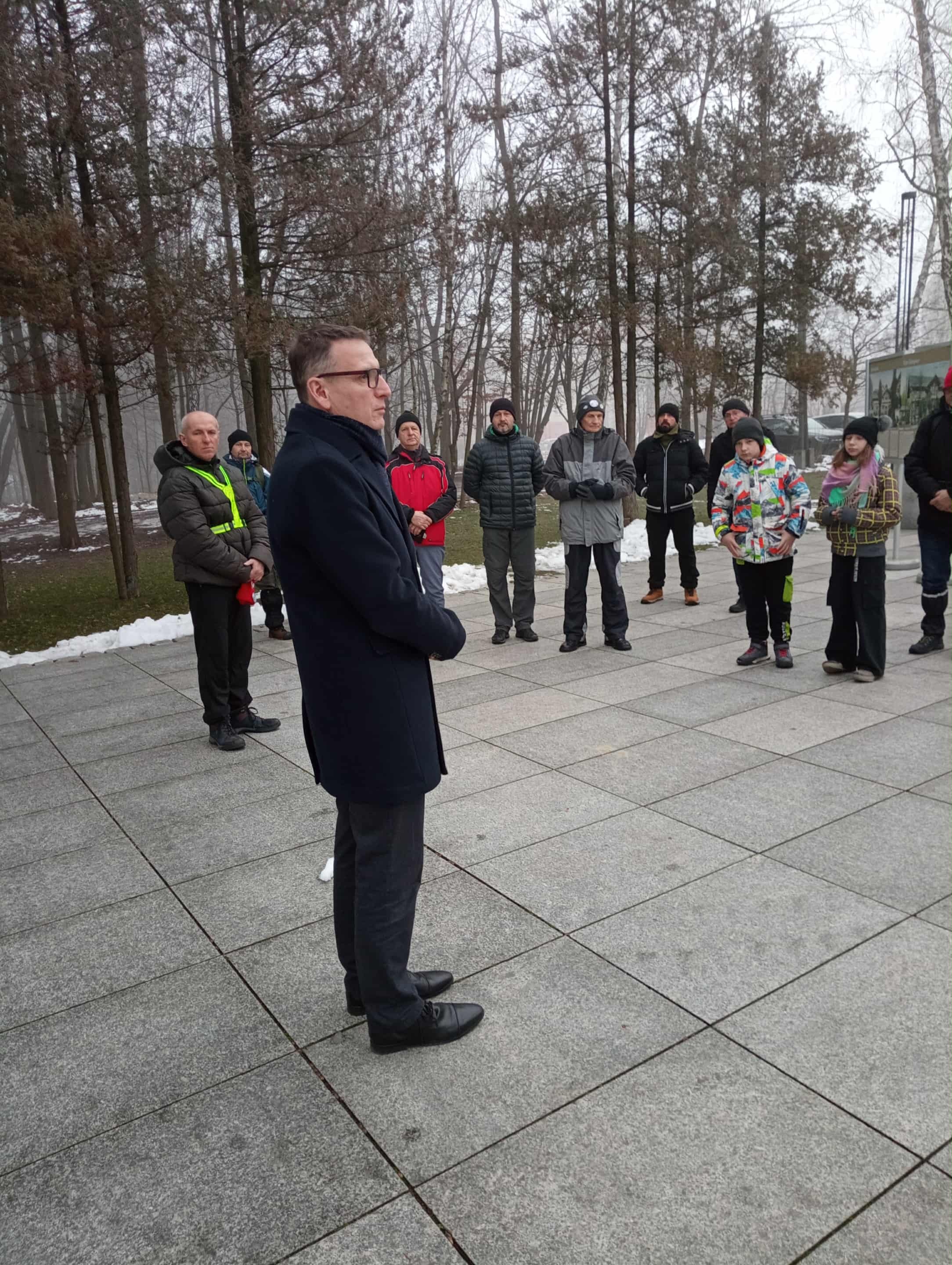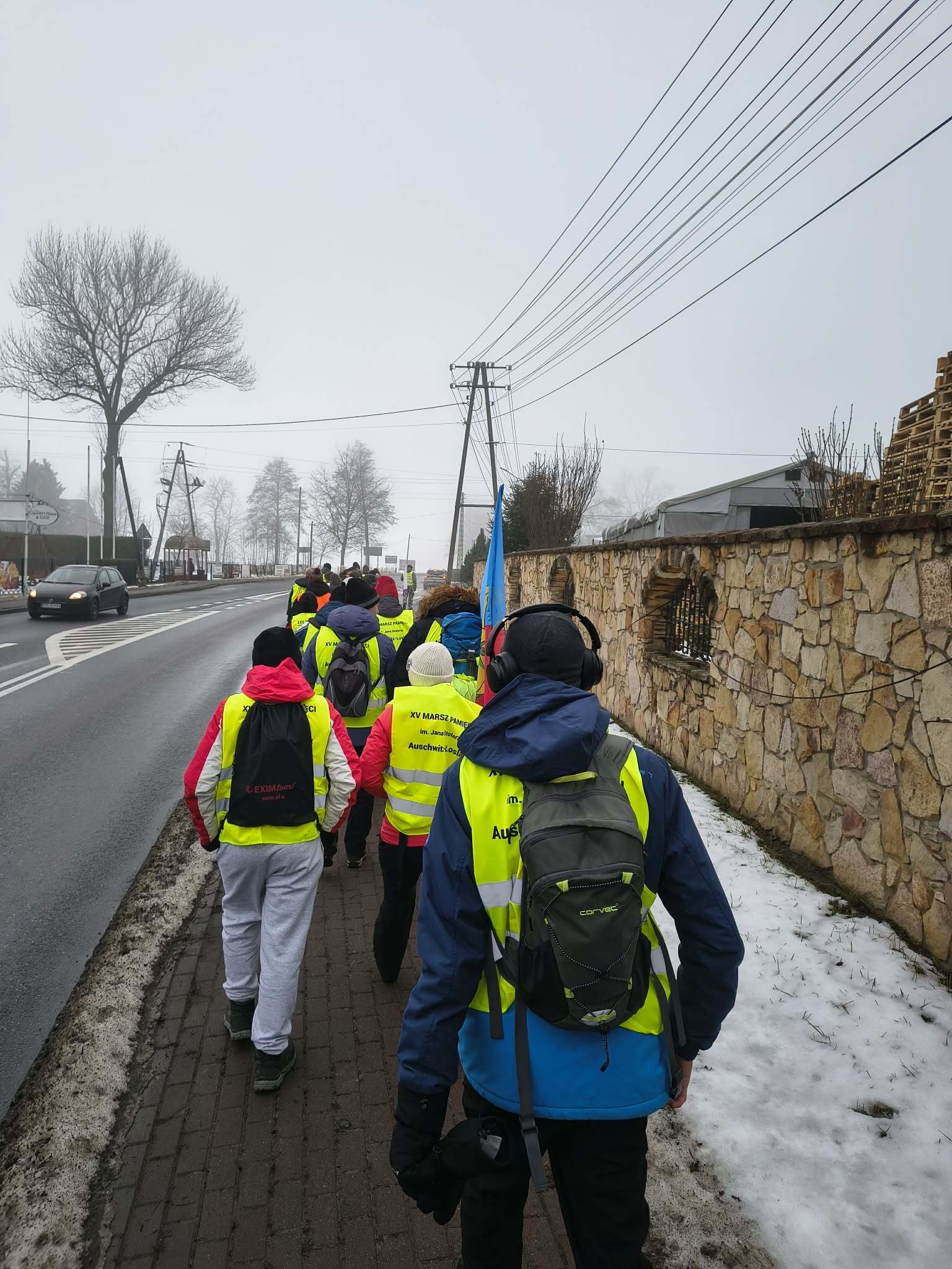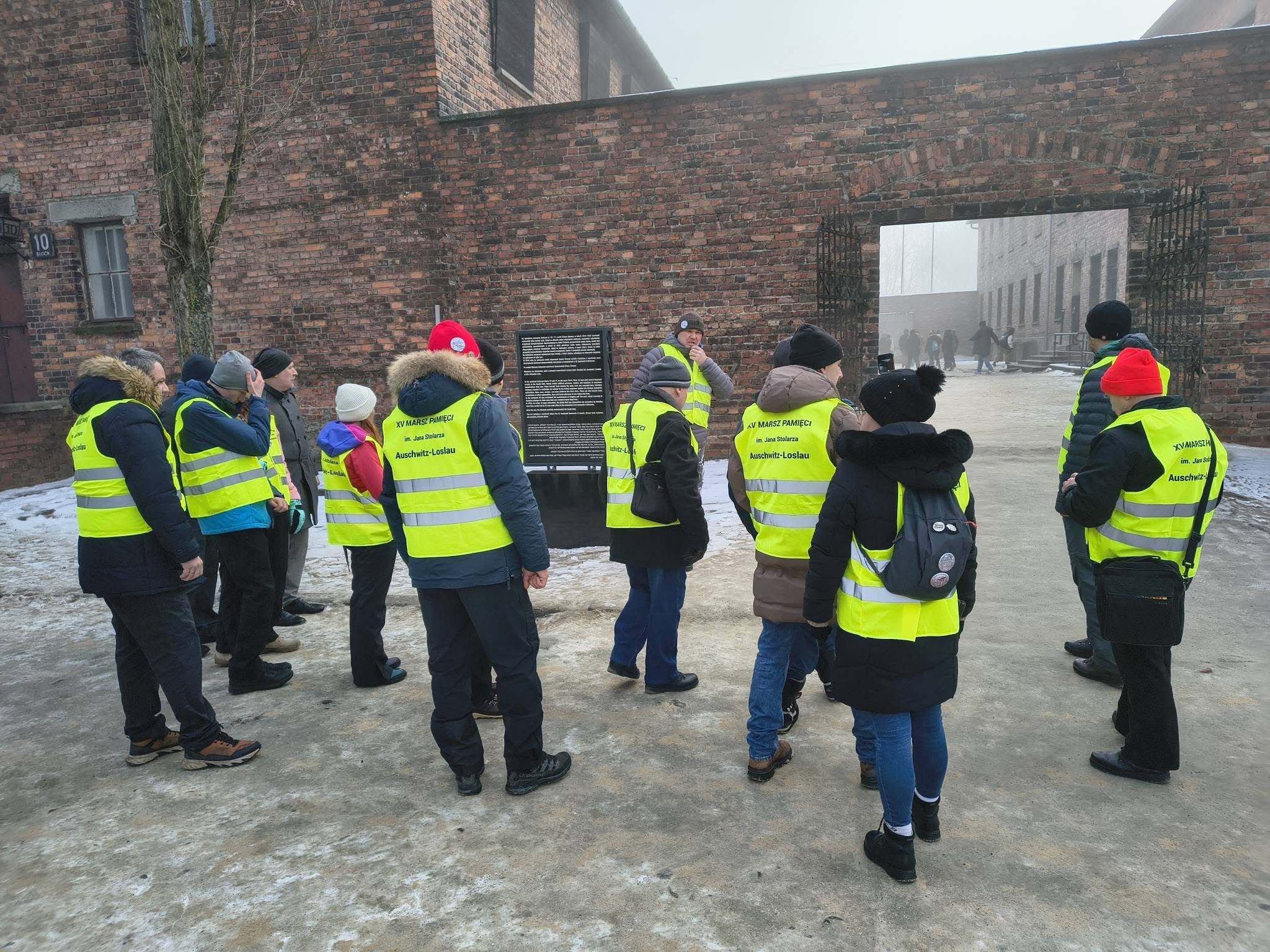 16 stycznia 2025 roku uczestnicy XIV Marszu Pamięci spotkali się przed wejściem na teren Muzeum – Obozu KL Auschwitz – Birkenau w Oświęcimiu. O godzinie 9.30 rozpoczęto przedsięwzięcie od krótkiej uroczystości pod „ścianą straceń”. W pierwszej kolejności złożono wiązanki kwiatów oraz zapalono znicze. W naszej grupie byli przedstawiciele władz powiatu wodzisławskiego – Witold Mandrysz oraz Andrzej Kania – którzy uczcili ofiary tego miejsca w imieniu mieszkańców Wodzisławia i okolic. Ponadto kwiaty oraz znicze złożyli Hanna Blokesz – Bacza – menedżer Pałacu Dietrichsteinów oraz Sławomir Kulpa – dyrektor Muzeum w Wodzisławiu Śląskim. W dalszej kolejności minutą ciszy, krótką modlitwą oraz zapaleniem zniczy w miejscu, gdzie życie straciły tysiące więźniów, wszystkie ofiary uczcili również uczestnicy Marszu Pamięci. Podczas uroczystości upamiętnienia poległych na terenie KL Auschwitz – Birkenau oraz na trasie ewakuacji więźniów ze stycznia 1945 roku, głos zabrał również Robert Furtak – komandor Marszu Pamięci i przedstawiciel Towarzystwa Miłośników Ziemi Wodzisławskiej. Zwrócił on uwagę na powagę miejsca, ale również krótko omówił historię marszu, którego pomysłodawcą był nieżyjący już Jan Stolarz. Rys historyczny ewakuacji obozu, a także najważniejsze fakty dotyczące trasy do Wodzisławia Śląskiego przedstawił tutaj wspomniany dyrektor wodzisławskiego muzeum. Ostatnim akordem pobytu w muzeum były tradycyjne pamiątkowe fotografie całej grupy pod „ścianą straceń” oraz bramą obozową z napisem „Arbeit macht Frei”. Następnie grupa piechurów wyruszyła na czterodniową trasę, aby przy wszystkich miejscach pamięci oddać hołd tym, którzy brali udział w tragicznej ewakuacji, a zwłaszcza wszystkim więźniom, którzy nie przetrwali tej gehenny… Pierwszym odwiedzonym miejscem na trasie był tzw. mały cmentarzyk nieopodal Muzeum – Obozu (mieści się przy ul. Więźniów Oświęcimia). Oddano tutaj hołd ofiarom, zapalono znicze przy pamiątkowej tablicy, w Robert Furtak omówił dokładny plan XIV Marszu Pamięci. Następnie wszyscy chętni do pokonania całej trasy wyruszyli pieszo w kierunku miejscowości Brzeszcze. Po około dwóch godzinach uczestnicy przedsięwzięcia dotarli na cmentarz w Brzeszczach, który znajduje się przy ul. Dąbrowskiego. Tutaj zatrzymano się przy zbiorowej mogile więźniów, który stracili życie w marszu ewakuacyjnym. Odwiedzono również miejsce spoczynku więźniarki KL Auschwitz – Sabiny Talar – oraz grób dzieci, których matki przeżyły „piekło” obozu… Tradycją Marszu Pamięci stają się krótkie wystąpienia uczestników. Przy każdej mogile czy pomniku głos zabiera Robert Furtak, a rozważania modlitewne prowadzi Zbigniew Bubak (członek Towarzystwa Miłośników Ziemi Wodzisławskiej). O tych tragicznych dniach oraz Bohaterach tamtego czasu - przy użyciu poetyckich wersów - wspomina Monika Mrozek. Swoimi refleksjami mogą podzielić się wszyscy uczestnicy wydarzenia, co często jest początkiem ciekawych i wzruszających rozmów… Kolejnym miejscem, w którym piechurzy zatrzymali się na dłuższy czas był pomnik w Jawiszowicach. Mieści się on w parku przy ul. Dworcowej, gdzie w czasie II wojny światowej funkcjonował podobóz KL Auschwitz – Jawischowitz. Uczestnicy marszu pochylili się nad historią tego miejsca, a przytoczono również przykłady wspomnień i świadectw, które dają obraz sytuacji w jawiszowickim obozie… Po krótkiej modlitwie, chwili ciszy i zapaleniu zniczy grupa ruszyła w kierunku Miedźnej, gdzie w miejscowej szkole piechurzy zatrzymują się na pierwszy nocleg. Tradycyjnie grupa dotarła tutaj w godzinach wieczornych.